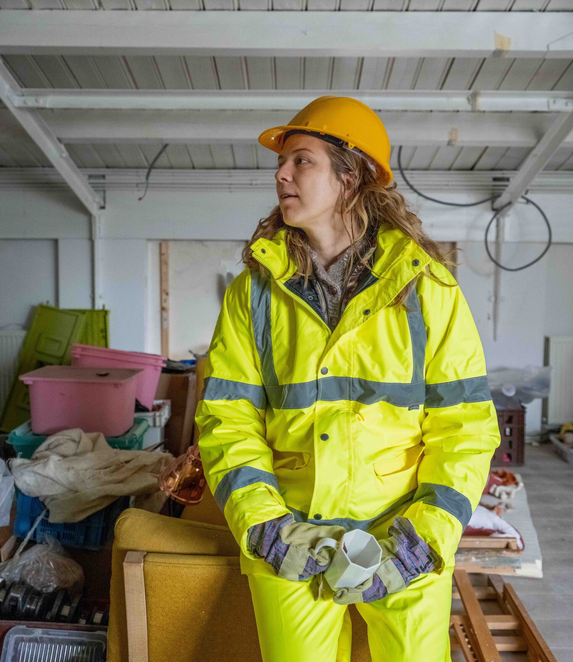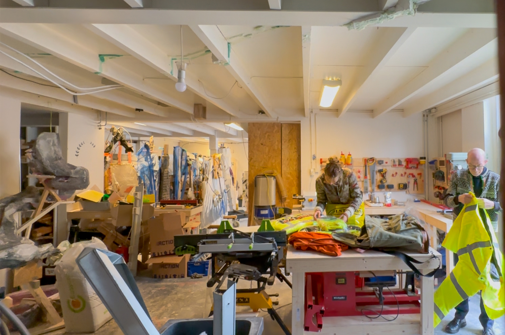 Dat heeft te maken dat ik me steeds meer presenteer in werkkleding. Ik vind het leuk om kleding vanuit een ander werkveld te dragen, bijvoorbeeld van vuilnismannen omdat ik daar ook een project mee heb gedaan, maar ook omdat het deel uitmaakt van het dagelijks leven. Als kunstenaar loopt privé en zakelijk altijd door elkaar, en er is geen werkpak om het verschil duidelijk te maken, je werkt dus altijd. Daarom vind ik het dragen van werkpakken noodzakelijk. Voor de foto hebben mijn mentor en ik werkpakken aangetrokken en ook de fotograaf moest meedoen om hem onderdeel van het geheel te maken en ook zichtbaar te laten zijn in het werkproces. Ik wil ook zo’n situatie als een foto of een interview niet voor lief nemen, daar denk ik dan over na en ook wat mijn mogelijkheden zijn. Waarom doe ik dit, wat is de intentie en dan beslis ik wat mijn houding hierin is.
